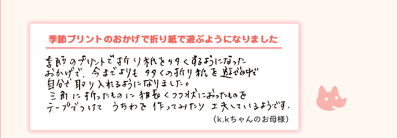 はさみを使ったりのりではったり、少し手先が使えるようになってきました。直線に近いものも描ける時もあったり・・・。でもまだクレヨンの上に出るのが、人差し指だけでなく中指も乗ってしまいます。それでも以前に比べてずいぶんしっかりした線が書けていると思います。